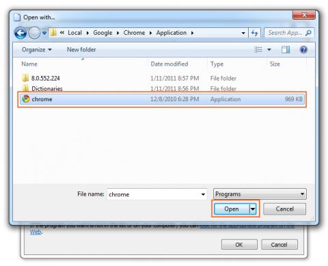 - Hộp thoại Open with xuất hiện, bên dưới là danh sách các chương trình có khả năng mở và đọc tập tin PDF, bạn nhấn vào nút Browse và trỏ đến tập tin thực thị (chrome.exe) của Google Chrome > Open. Sau đó, trở lại giao diện Open with > nhấp vào nút OK để chấp nhận đây là ứng dụng mặc định mở file.